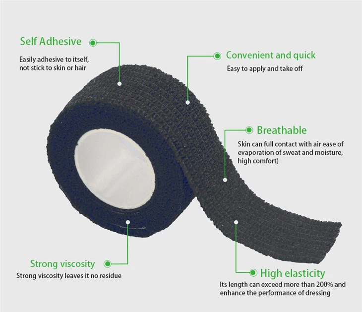 Qara yapışqan bandaj, elastik bezin hər iki tərəfində təbii bir polimer hissəcikləri ilə örtülmüş və müəyyən bir proseslə işlənmiş yüksək keyfiyyətli elastik parça ilə hazırlanmışdır. Yapışqan bandaj qara məhsul saç, dəri, paltarlara yapışmır və tər halında düşmür. Öz-özünə yapışan elastik bandajlar vahid parıltı, təmiz kəsiklər, qoxu, ləkələr və məruz qalan buruqlara sahib olmalıdır; qırılma qüvvəsi 10n / sm-dən az olmamalıdır; Öz-özünə yapışan 3n / sm-dən az olmamalıdır; uzanma 50% -dən az olmamalıdır; Dəri qıcıqlanması yoxdur. Məhsul, tibbi təzyiqə həssas bir yapışan və ya təbii lateks, qeyri-toxunuşlu parça, kinesio patch, elastik parça, tibbi boşaltma mauzası, elastik toxunmamış parça və təbii kauçuk kompozit materiallar hazırlanmışdır. Ayrıca ortopediyada, ümumi cərrahiyyə, ortopediya və damar xəstəliklərində xəstələri sarğı üçün ideal bir məhsuldur.